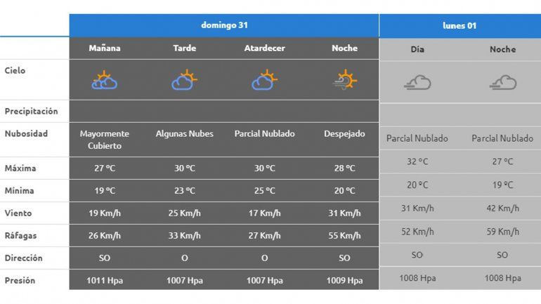 Por la mañana del 31 de diciembre, la máxima será de 23°. Los vientos no serán muy fuertes como el primer día del año, ya que las ráfagas llegarán a los 33 km/h.