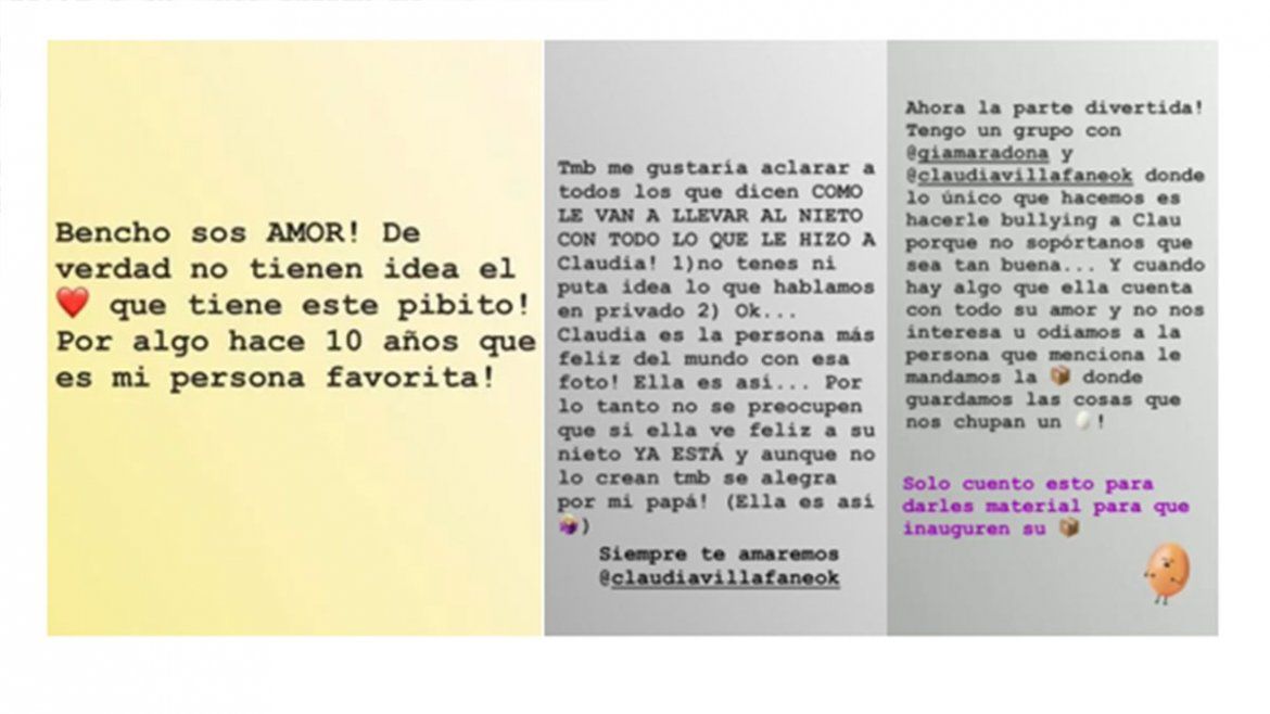 En sintonía, Giannina le dedicó unas emotivas palabras a Claudia destacando su actitud componedora, más allá de su disputa con El Diez. "Si supieran quien le habla con tanto amor a mi hijo de su abuelo, si supieran que ella es quien responde a las preguntas futbolísticas de mi hijo... Yo era chica y muchas cosas que Benja me pregunta no tengo la menor idea... Ella recuerda cada detalle y no finge, lo cuenta con amor y por eso logra transmitirlo, como aún lo hace con nosotras cuando recurrimos a sus abrazos... (siempre recurrimos a ella, para un vestido, un estudio o que cuide a nuestros hijos)", destacó.