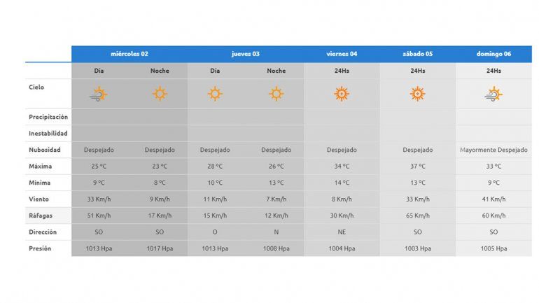 El miércoles podría haber algunas ráfagas que alcancen los 50 km/h y temperaturas que no superarán los 25°C. El jueves sube un poco el calor, hasta los 28°C y calma el viento, tendencia que se mantendrán el viernes con máximas de hasta 34°C.