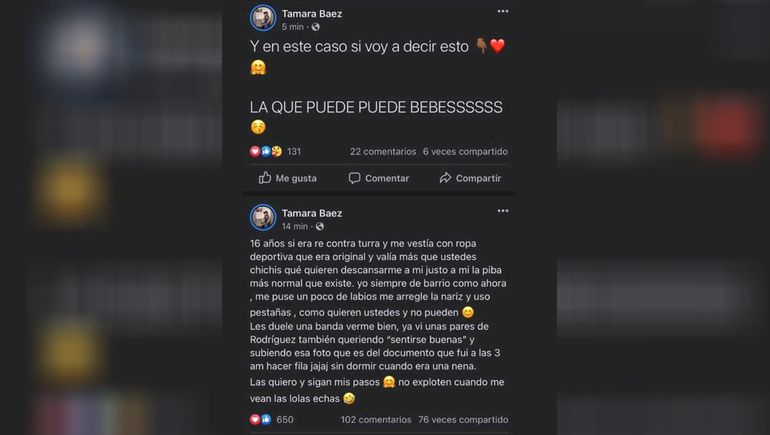 Aunque muchos la defendieron, las críticas por su transformación llovieron a montones y lejos de esquivar la polémica, Tamara hizo un descargo en Facebook y fue letal. “16 años. Sí, era recontra turra y me vestía con ropa deportiva que era original y valía más que ustedes chichis. ¿Quieren descansarme a mí, justo a la piba más normal que existe? Yo siempre de barrio, como ahora”.
