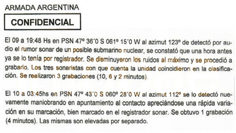 La respuesta que recibió la tripulación fue “disminuir los ruidos al máximo”, además de grabar lo que captaban. Los operadores del sonar del navío argentino señalaban que “coincidieron en la clasificación” de que se trataba de un submarino nuclear y procedieron a captar las señales que luego enviaron a sus superiores.