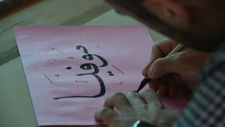 Escribe al revés, de derecha a izquierda, como se escribe en su idioma. No usa reglas ni renglones, pero logra un acabado perfecto, con trazos prolijos y la dosis justa de tinta para hacer de su texto una pintura. Después, elige una caña más fina para hundirla en el frasco de color rojo y dibujar unos arabescos que acompañan cada símbolo de su alfabeto.