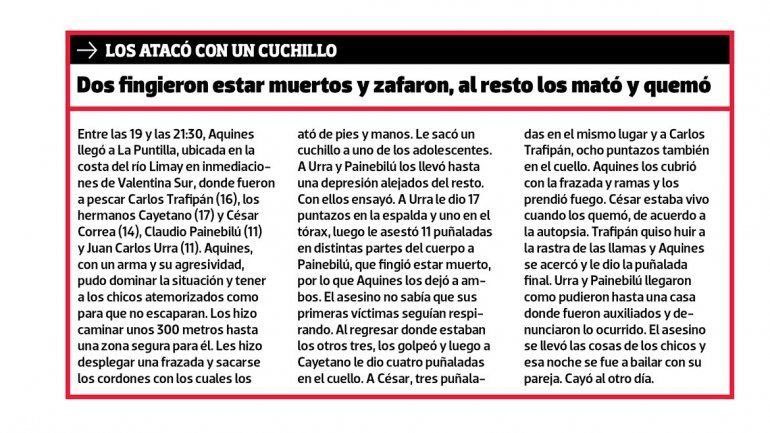 El 14 de noviembre de 1998 la costa del río Limay se transformó en un escenario macabro. Aquines atacó a cinco chicos: dos zafaron fingiendo estar muertos pero a los otros tres los asesinó y los quemó. Por este episodio fue condenado a prisión perpetua.