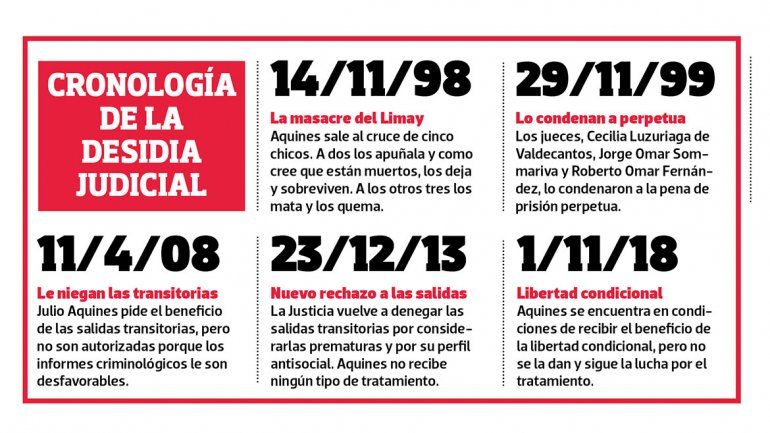 Neuquén. Se cumplen 20 años de uno de los asesinatos múltiples más importantes de la historia contemporánea de Neuquén. El asesino, Julio Aquines, está en condiciones de recibir el beneficio de la libertad condicional, pero nadie quiere autorizarla porque los informes crimonológicos le son desfavorables. Su defensora oficial, Luciana Petraglia, requirió un tratamiento cognitivo conductual, pero no hay profesionales que lo brinden.