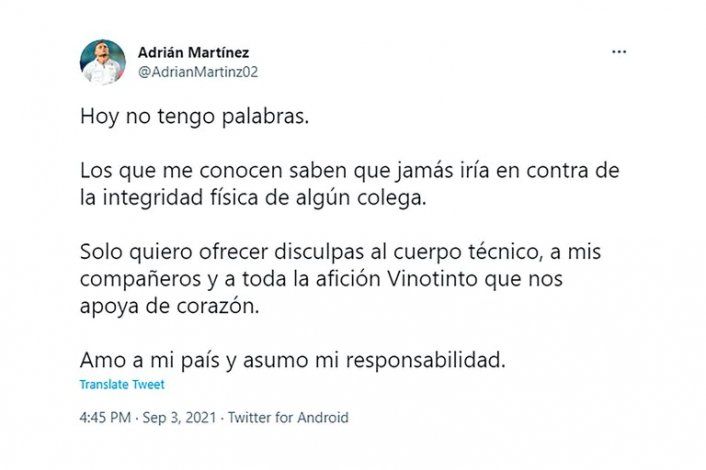 “Hoy no tengo palabras. Los que me conocen saben que jamás iría en contra de la integridad física de algún colega”, fueron las primeras palabras que utilizó Martínez.
