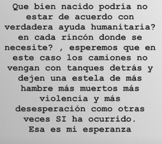 Por último, le dedicó unas líneas a quienes lo tildaron de chavista por su publicación: "¿Qué bien nacido no podría estar de acuerdo con verdadera ayuda humanitaria?, esperemos que en este caso los camiones no vengan con tanques detrás y dejen una estela de más hambre, más muertos, más violencia y más desesperación como otras veces SÍ ha ocurrido. Esa es mi esperanza".