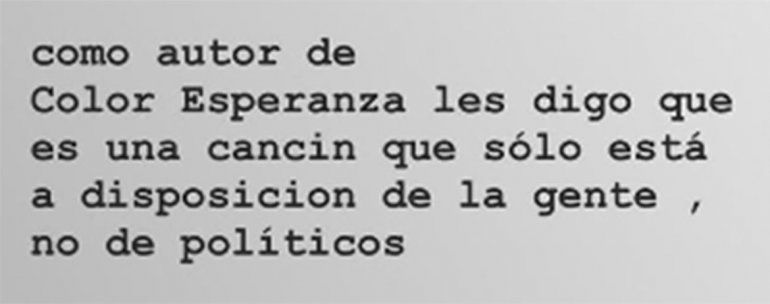 A través de su cuenta de Instagram, el músico sostuvo: “Partidos políticos de todos lados y colores me han ofrecido cientos de miles de dólares para usar ‘Color Esperanza’ en campañas. Nunca acepté, siempre me negué incluso en momentos que los necesitaba mucho”.