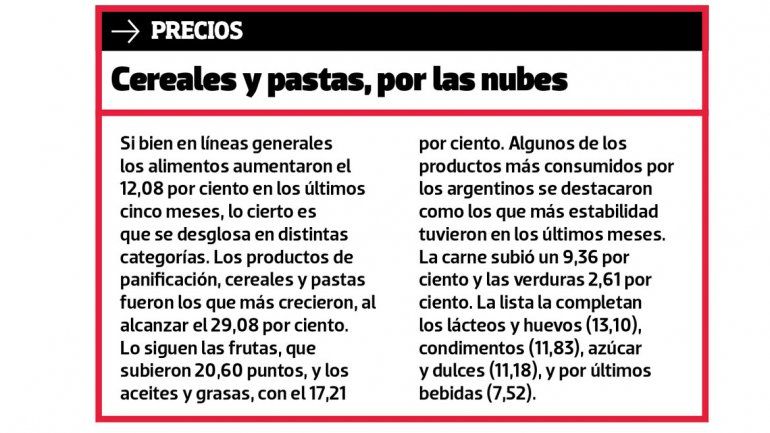 Los alimentos, por otro lado, crecieron un 12,08 por ciento en estos cinco meses. Dentro de este rubro, los productos de panificación, cereales y pastas encabezaron la lista con un incremento del 29,08 por ciento (ver aparte). Desde febrero, las variaciones mensuales oscilaron entre el punto y los tres puntos y medio.
