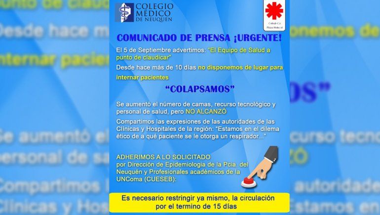 “No estamos diciendo nada nuevo, sino que estamos solicitando explícitamente algo que se viene pidiendo hace varios días. Ya lo han dicho las autoridades de los servicios de internación de clínicas y hospital… hace más de 15 días que tenemos 99% de ocupación y desde el punto de vista sanitario y epidemiológico es necesaria la restricción porque está comprobado que es lo único que sirve para evitar la propagación del virus”, contó a LMN y aclaró que actualmente hay paciente de Neuquén capital que están siendo derivado al interior.