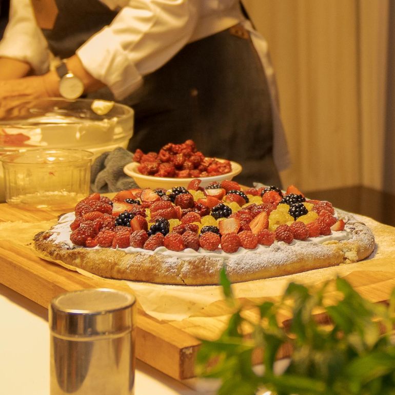 Finalizando la clase magistral, Irigoyen volvió a tomar el mando para deslumbrar con una tarta rústica de frutas frescas, para la cual preparó una masa sencilla de manteca, que hizo de base para luego apilar una capa de mermelada de frambuesa Sabor Natural, una crema de almendras y una suculenta mezcla de duraznos, frutillas y frambuesas de la huerta. Luego de una horneada, se completó con más frambuesas de dos colores, frutillas, moras y copos de crema montada.