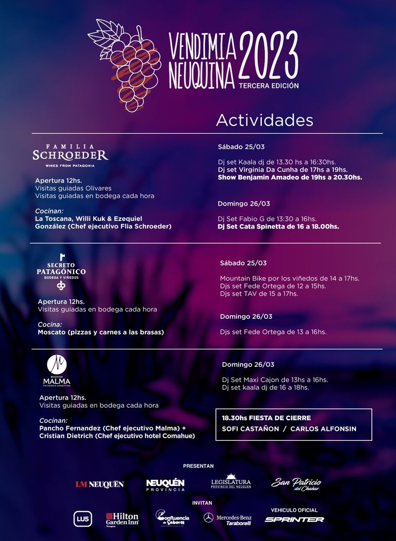 En esta edición, las bodegas anfitrionas Malma, Familia Schroeder, Secreto Patagónico y Bodega del Fin del Mundo abrirán sus puertas a la comunidad y a los visitantes, ofreciendo diferentes actividades, como visitas guiadas, catas, propuestas gastronómicas con chefs invitados y residentes, shows musicales y DJ sets que acompañarán el atardecer, entre otras propuestas que se desarrollarán durante las dos jornadas.