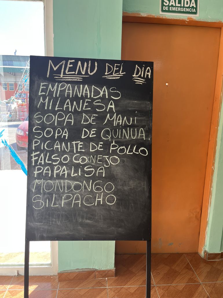 Ingresas al mercado por el acceso principal, pasas la barrera y doblas a la izquierda hasta dónde corta y comienza la nueva nave sur. Allí aparece un saloncito con algunas mesas y sillas, un par de heladeras y una pizarra que promete varios platos típicos de Bolivia.
