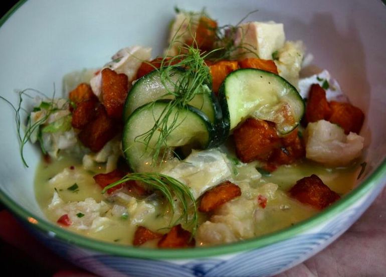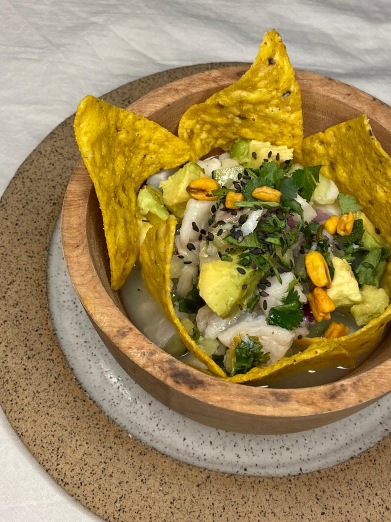 El pescado viene de San Antonio Oeste. Generalmente los jueves y se trata de mero. De ahí sale el ceviche que tiene coco, leche de Tigre y boniato frito (morrón, cebolla y un toque de Merken para darle identidad originaria). También hay una opción veggie con cochayuyo (un alga típica de Chile) morrón, limón, hongos portobellos, leche de coco y cilantro.