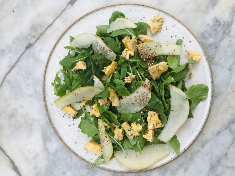 Ensalada de rúcula, peras asadas, queso azul y nueces