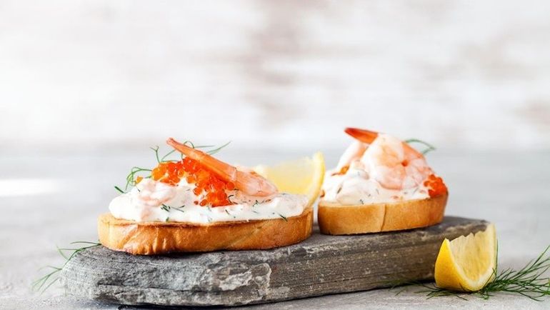 Toast Skagen es un sándwich abierto sueco clásico y elegante que generalmente se sirve como aperitivo. Se elabora con pan blanco, gambas, mayonesa, mostaza Dijon, huevas de pescado blanco, eneldo, limón y mantequilla. Se quita la corteza del pan, que luego se saltea en mantequilla hasta que se dore.