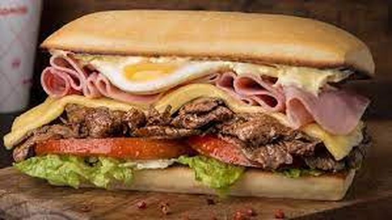 “Ésta es una versión extrema de un sándwich de bistec: relleno con filete de lomo en rodajas finas, tomates, cebollas, lechuga, mayonesa, salsa chimichurri, jamón, queso y un huevo frito, el sándwich de lomo o lomito es un sándwich gigante que seguro saciará incluso a los consumidores más hambrientos”, indica la publicación.