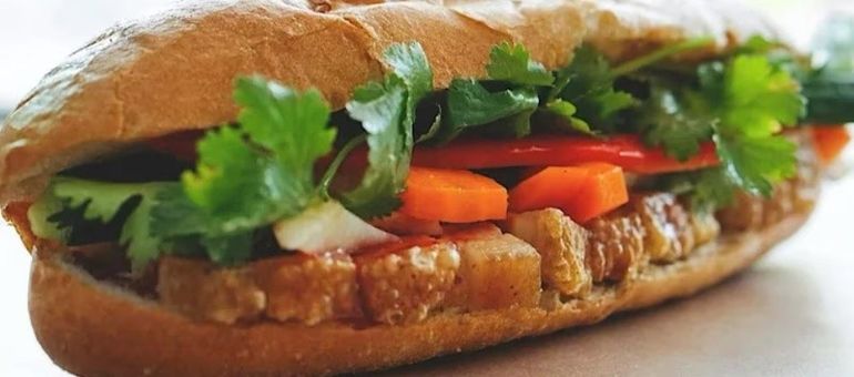 El bánh mì heo quay es una variación tradicional vietnamita del sándwich bánh mì elaborado con panceta de cerdo asada como ingrediente principal. El cerdo se asa con una gruesa capa de sal y especias. Se corta en rodajas y se sirve en un panecillo bánh mì recién horneado.Luego, el sándwich se viste con una combinación de mayonesa, zanahorias en escabeche y daikon, pepinos, cilantro y cebolletas. Si lo desea, se pueden agregar chiles en rodajas al sándwich como aderezo, haciéndolo muy picante. Un lado de bánh mì heo quay también se puede untar con paté de hígado de pollo antes de agregar la panceta de cerdo en rodajas al sándwich.