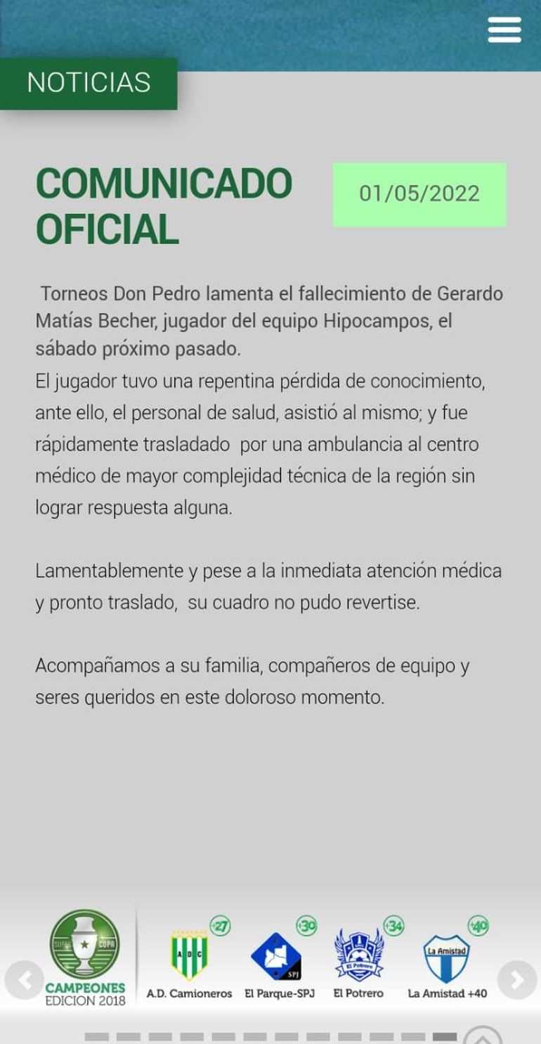 "Torneos Don Pedro lamenta el fallecimiento de Gerardo Matías Becher, jugador del equipo Hipocampos, el sábado próximo pasado", comienza el comunicado publicado por la organización del certamen, que se difundió este domingo tras la dolorosa noticia.