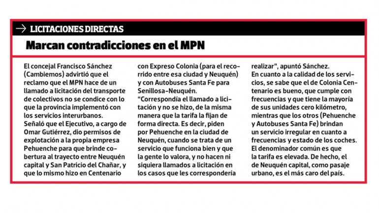 El concejal de Cambiemos Francisco Sánchez dijo que el tema “es complejo y no fácil de resolver”, y apuntó a las contradicciones del MPN, en cuanto a que con otros servicios interurbanos de colectivos la provincia los prorrogó de manera directa y fijó las tarifas.