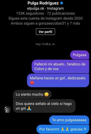 "Pulga. Falleció mi abuelo, fanático de Colón y de vos. Mañana hacés un gol, dedicáselo", le escribió Camila Bertotti el viernes previo al partido. Instantáneamente, Rodríguez le respondió: "Lo siento mucho. Dios quiera, señalo al cielo si hago un gol". Tras anotar el 1-0 parcial de tiro libre, el tucumano cumplió con su promesa y en su festejo apuntó al cielo.
