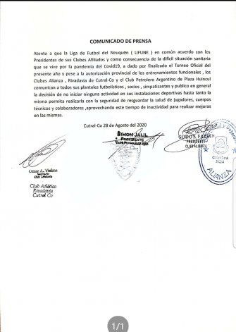 Alianza firmó un comunicado en el mismo sentido que sus vecinos de Petrolero Argentino de Plaza Huincul y Rivadavia, también de Cutral Co.