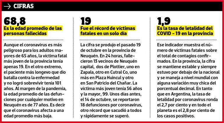 Sin embargo, faltan los datos de septiembre y octubre, los meses más negros de la expansión del COVID-19 en Neuquén. Sólo en las últimas tres semanas, el coronavirus dejó 242 víctimas fatales a nivel provincial, es decir, que más de la mitad de las muertes por la pandemia se produjeron en el mes en curso.
