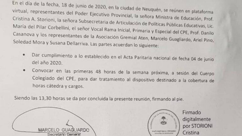 Según el acta firmada por las partes al finalizar la reunión, acordaron en dar cumplimiento al acta paritaria nacional firmada el pasado 4 de junio y a convocar a sesión del cuerpo colegiado en las primeras 48 horas de la próxima semana "para dar tratamiento al dispositivo destinado a la cobertura de horas cátedra y cargos".