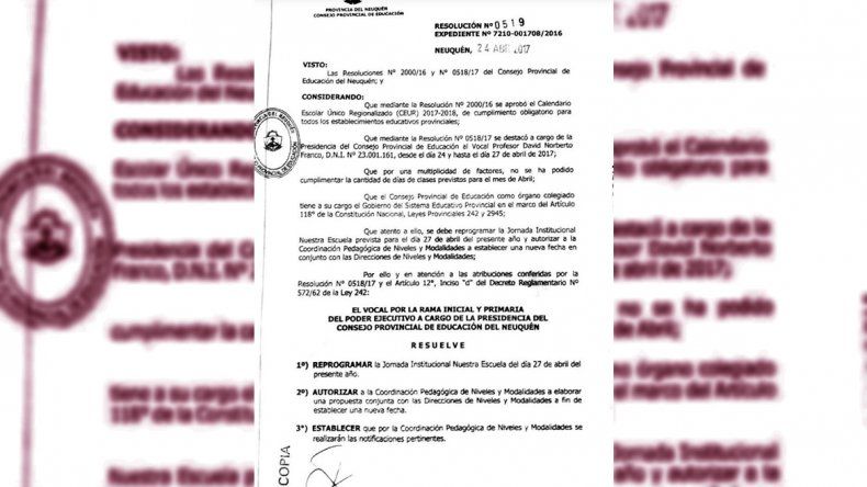 En un resolución firmada ayer, el Consejo Provincial de Educación dispuso el aplazamiento de la jornada institucional Nuestra Escuela que debía realizarse en todas las escuelas neuquinas el próximo jueves 27 de abril.