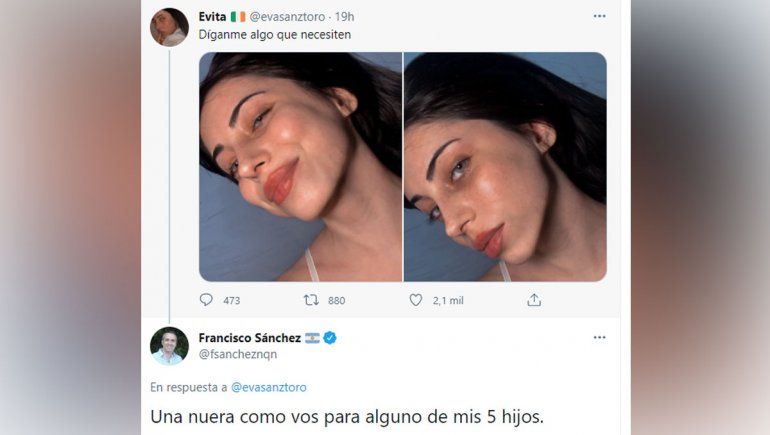 Y es que la usuaria @evasanztoro, de 18 años, publicó este domingo dos imágenes de ella con la frase "Díganme algo que necesiten". El legislador neuquino respondió pocas horas después: "Una nuera como vos para alguno de mis 5 hijos".
