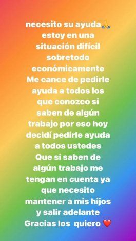 "Necesito su ayuda. Estoy en una situación difícil, sobre todo económicamente. Me cansé de pedir ayuda a todos los que conozco si saben de algún trabajo, por eso hoy decidí pedirle ayuda a todos ustedes", reconoció en una de sus historias de Instagram. Y continuó: "Si saben de algún trabajo ténganme en cuenta ya que necesito mantener a mis hijos y salir adelante. Gracias, los quiero".