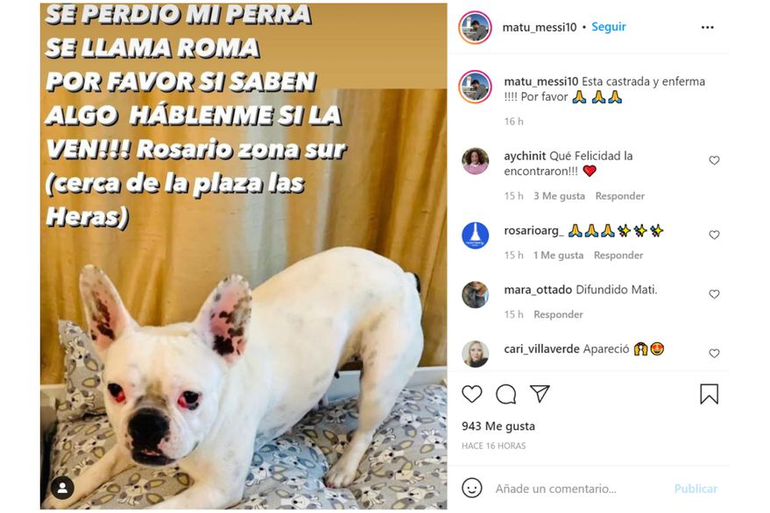 Afortunadamente, unas horas después del pedido, el hermano del astro argentino compartió una actualización de la búsqueda y manifestó que habían hallado a Roma. “Ya la encontramos. Muchas gracias a todos por compartir”, indicó. Entre los cientos de comentarios de sus followers, la mayoría celebró con emojis la alegre noticia.