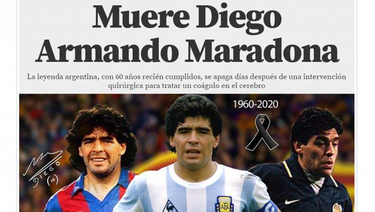Tras conocerse el fallecimiento de Maradona, el medio español publicó que "el mítico 10' argentino, actual entrenador de Gimnasia y Esgrima La Plata, cumplió el pasado 30 de octubre 60 años de edad, pero días después tuvo que pasar por el quirófano para tratar un coágulo en la cabeza".