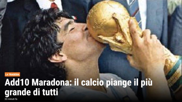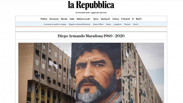 El diario La Repubblica de Italia dedicó escribió en la nota principal: "Cuántas vidas en una vida que ya no existía. Cuántas veces se ha perdido Diego, cuántas veces lo hemos perdido, incluso de vista. Maradona hospitalizado, Maradona engordado, Maradona operado, Maradona tóxico, Maradona dopado, Maradona alcohólico..."