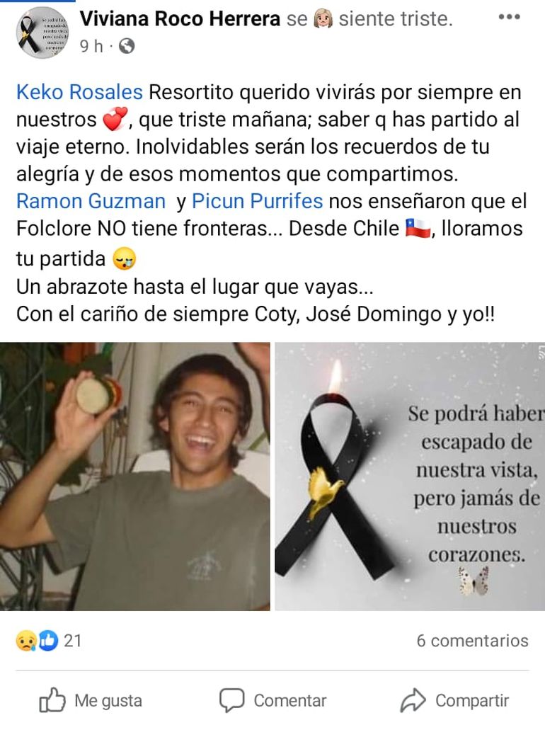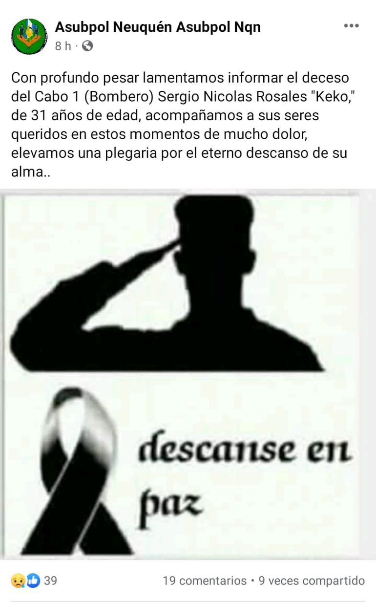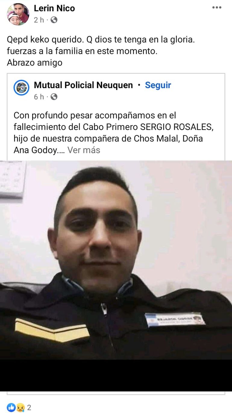 Este viernes la Policía confirmó su muerte y las muestras de dolor no se hicieron esperar en las redes sociales, donde compartieron fotos de Rosales junto a mensajes de despedida, principalmente de la zona de Chos Malal, de donde era oriundo.