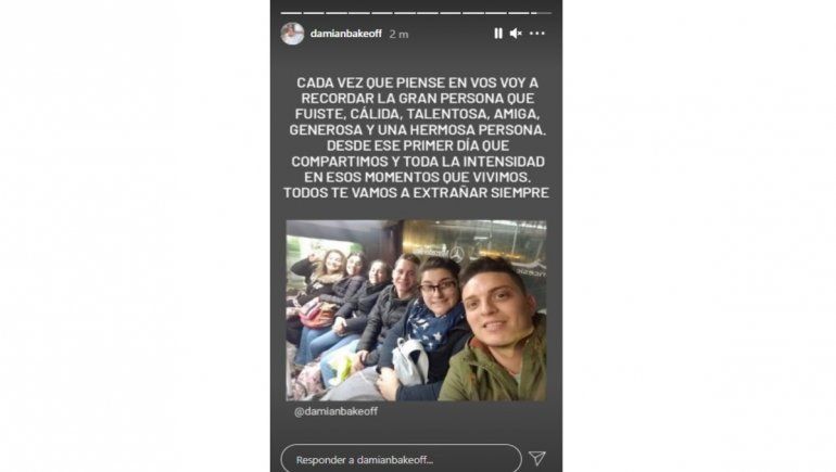 "Cada vez que piense en vos voy a recordar la gran persona que fuiste: cálida, talentosa, amiga, generosa y una hermosa persona", expresó Basile en una historia de Instagram junto a una postal donde aparece junto a Agustina y otros excompañeros de Bake Off.