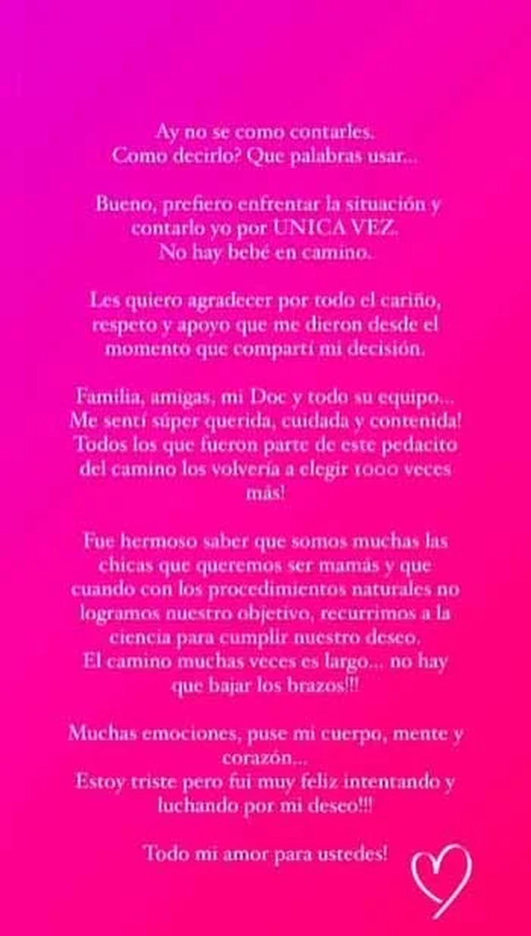 "Fue hermoso saber que somos muchas las chicas que queremos ser mamás y que cuando con los procedimientos naturales no logramos nuestro objetivo, recurrimos a la ciencia para cumplir nuestro deseo. El camino muchas veces es largo... ¡No hay que bajar los brazos!", reconoció alentando a seguir adelante a quienes estén en la misma situación que supo comenzar ella.