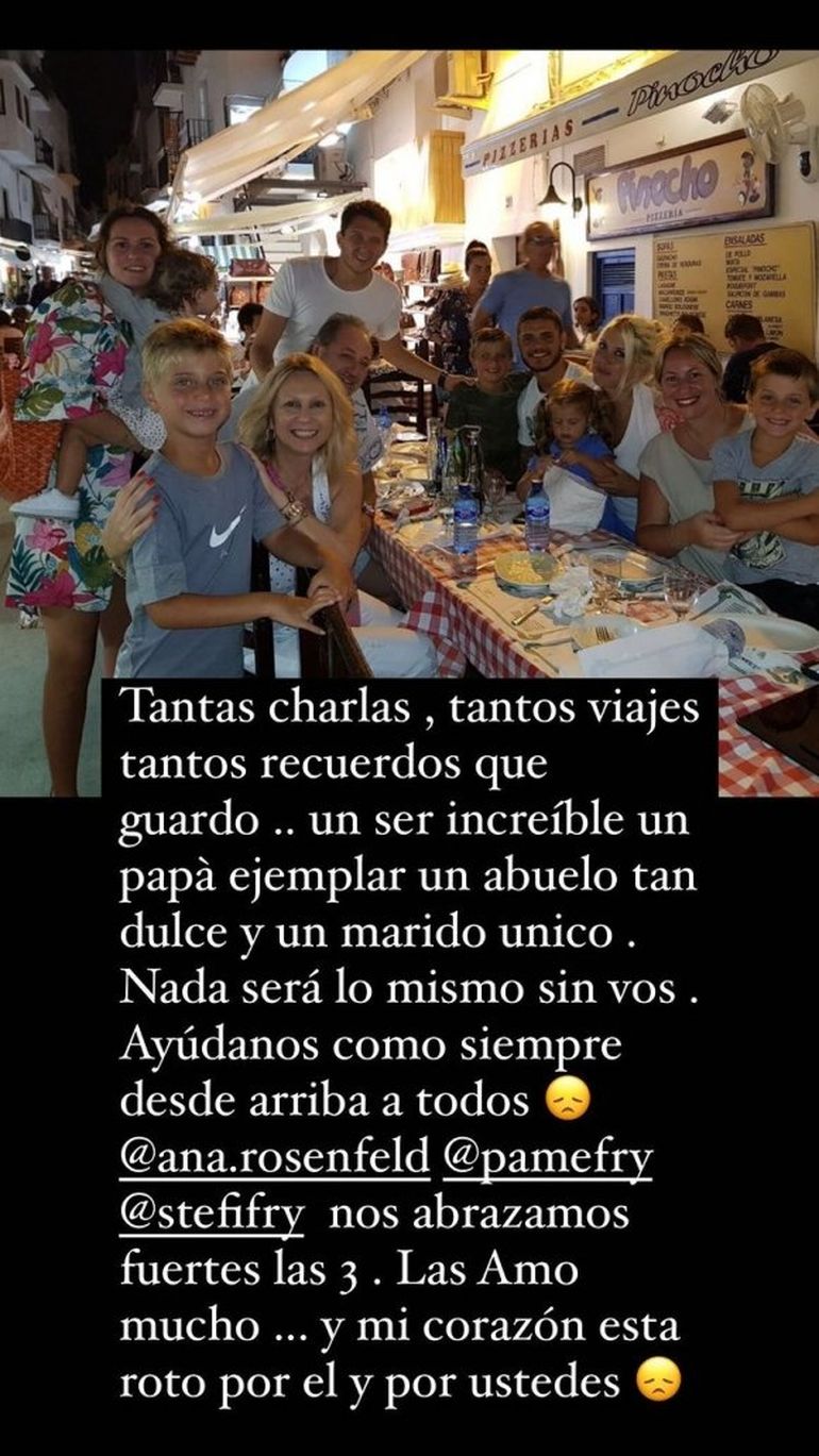“Tantas charlas, tantos viajes, tantos recuerdos que guardo. Un ser increíble, un papá ejemplar, un abuelo tan dulce y un marido tan único. Nada será lo mismo sin vos”, señaló, consternada, en un mensaje que le dedicó a la letrada y a sus hijas, Stephanie y Pamela.
