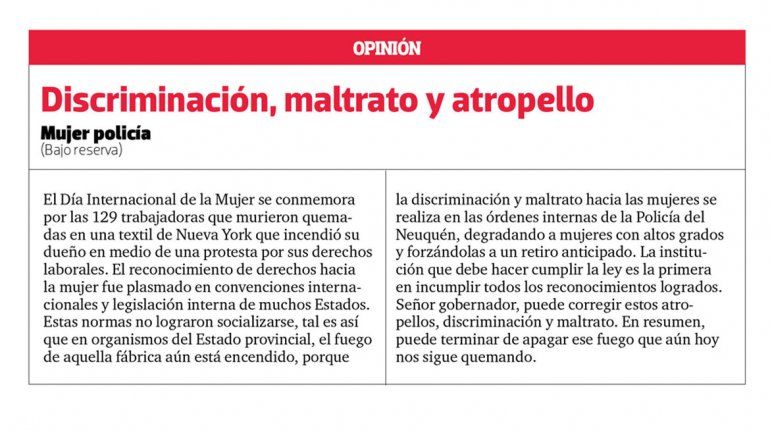 La verticalidad y los reglamentos antidemocráticos les impiden la libertad de expresión entre otras cosas. Por eso, bajo absoluta reserva, mujeres que están dentro de la institución policial contaron el drama que viven. Además, se quejaron del poco apoyo que reciben de los organismos de gobierno y de las organizaciones sociales que dejan a la mujer policía invisibilizada.