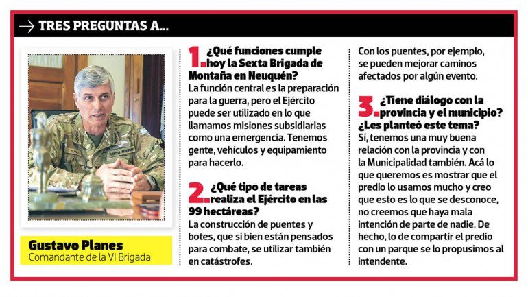 Neuquén.- El comandante de la VI Brigada de Montaña en Neuquén, general Gustavo Planes, solicitó ayer que se contemplen las actividades que el Ejército realiza en el predio de las 99 hectáreas que el estado nacional posee en Valentina SuCr. Este pedido se da a partir de que allí se proyecta la instalación de un polo energético y científico, además de un loteo para la construcción de viviendas.
