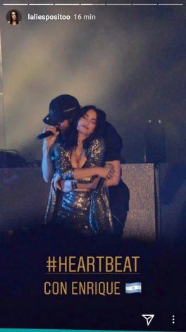 La propia Lali subió a su Instagram dos imágenes del show. En una de ellas se la puede ver a ella emocionada mientras Iglesias le tocaba su panza al descubierto.