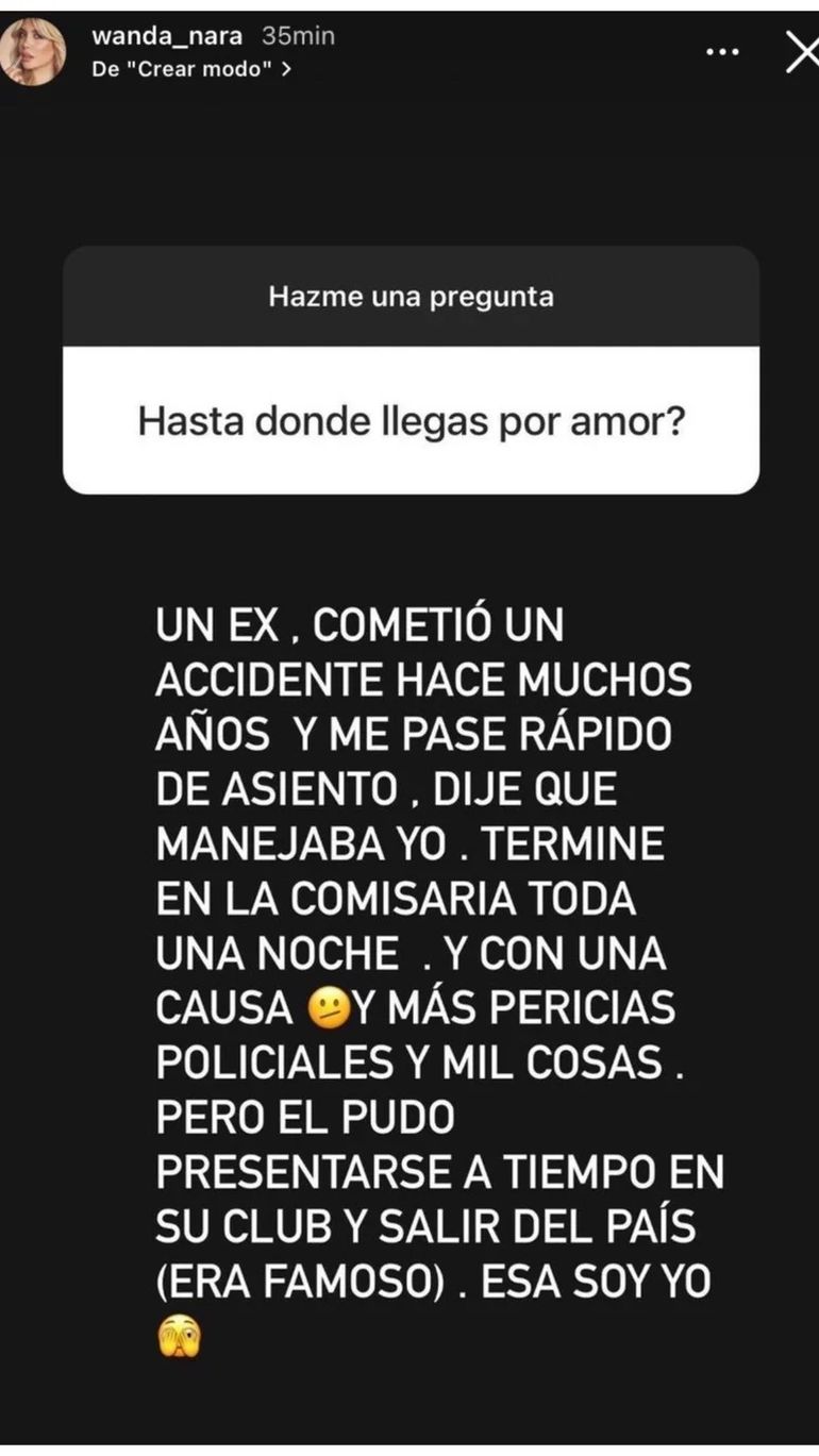Todo comenzó cuando un usuario quiso saber hasta dónde llegaría por amor. A lo que la mediática contestó recordando una situación con una expareja, aunque sin nombrarlo (se cree que pudo haber sido Maxi López, padre de sus tres hijos mayores). “Un ex cometió un accidente hace muchos años y me pasé rápido de asiento, dije que manejaba yo”, comenzó contando. Y detalló cómo finalizó la situación: “Terminé en la comisaría toda una noche. Y con una causa y más pericias policiales y mil cosas. Pero él pudo presentarse a tiempo en su club y salir del país (era famoso). Esa soy yo”.