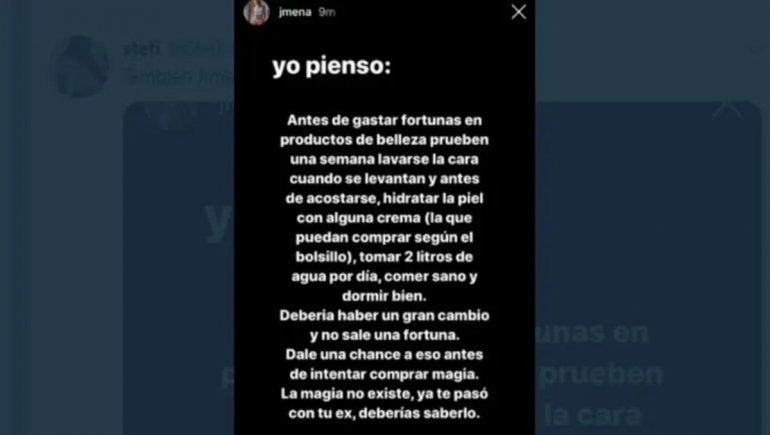 Mientras la actriz de Argentina, tierra de amor y venganza acudió a su cuenta de Twitter para avisar que no quiere vender "ninguna maquinita para la cara", "La Cobra" publicó una serie de stories en Instagram diciendo que para tener la piel linda no son necesarios productos caros , sino una rutina sana de vida.