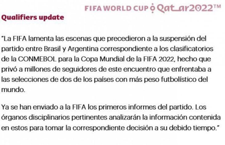 "La FIFA lamenta las escenas que precedieron a la suspensión del partido entre Brasil y Argentina correspondiente a los clasificatorios de la CONMEBOL para la Copa Mundial de la FIFA 2022, hecho que privó a millones de seguidores de este encuentro que enfrentaba a las selecciones de dos de los países con más peso futbolístico del mundo", rezan las primeras líneas del documento.