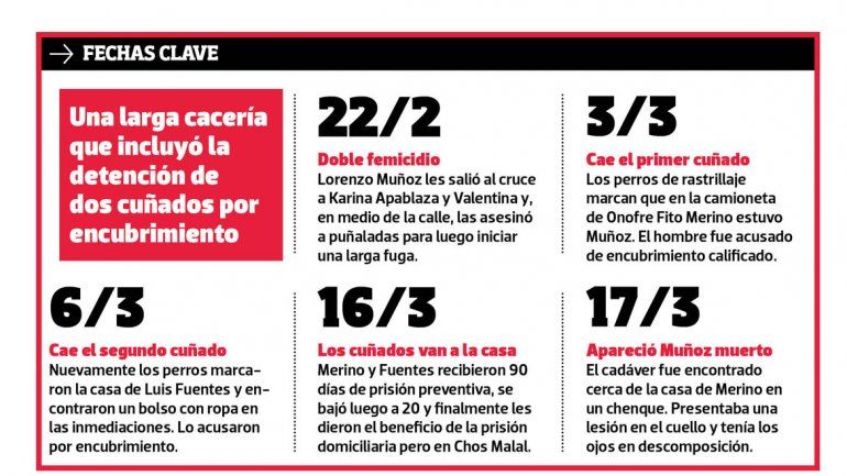 Tras 23 días prófugo y con más de un centenar de policías intentando cazarlo, Muñoz finalmente apareció ayer a las 18:30. Su cuerpo fue encontrado en un rastrillaje de rutina a unos 300 metros del lugar donde perpetró el doble crimen y a unos 150 metros de la casa del cuñado, Onofre “Fito” Merino, acusado por ayudarlo a escapar.