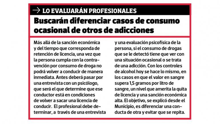 “Estimamos que vamos a hacer entre 20 y 25 muestras por procedimiento. Ante un resultado positivo, quien determinará el tiempo de retención o destrucción de licencia, lo mismo que el valor de la multa, será el juez de Faltas”, dijo Churrarín, quien explicó que pueden darse casos particulares. “Por ejemplo, el de alguna persona que tomó algo por prescripción médica. Esto puede actuar como atenuante pero no quita el hecho de que se le prohíbe seguir conduciendo, con lo cual se lo sanciona pero con una multa más leve”, precisó. “De lo contrario, si hubo intento de fuga u otro comportamiento agresivo, esa situación puede aumentar el valor de la sanción”, advirtió el funcionario municipal.