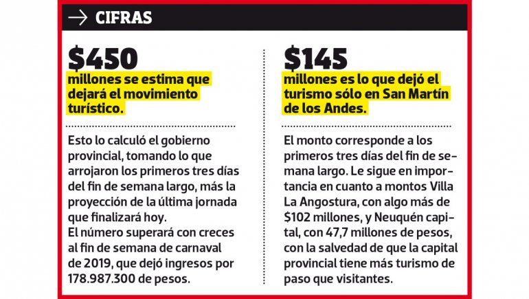 La primera de las ciudades cordilleranas registró 26.112 pernoctes durante las cuatro noches, mientras que La Angostura tuvo 17.848, ambas con un gasto diario de más de cinco mil pesos. Cerca de allí, Junín de los Andes tuvo un 95 por ciento de ocupación y 4700 pernoctes.