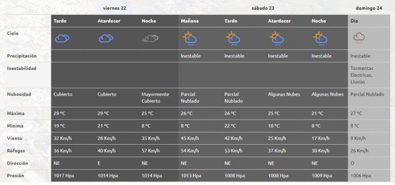 Hoy viernes, se presenta el día con tiempo bueno, cálido y estable sobre la región. Sin embargo, para mañana y pasado, se espera lluvia y viento en la ciudad. La inestabilidad comenzará a partir de esta noche, con probabilidad durante mañana y pasado de tormentas eléctricas y rachas de viento desde mañana a la tarde y el domingo.