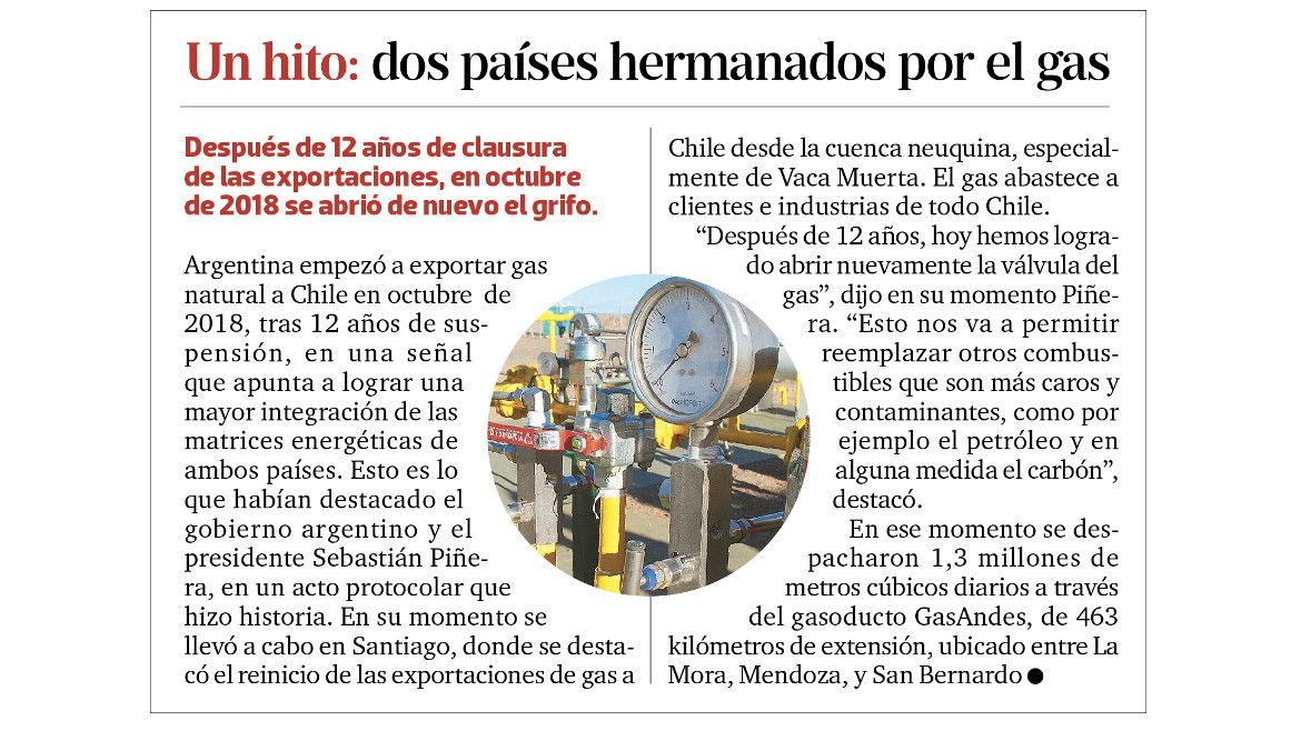 Finalmente, el gas neuquino pudo llegar a países limítrofes ante las dificultades del transporte y la demanda interna. En el último año, el gobierno nacional autorizó, en el contexto de la resolución 104/2018, de la Secretaría de Energía de la Nación, 24 solicitudes de empresas para exportar gas natural neuquino con distintos destinos.