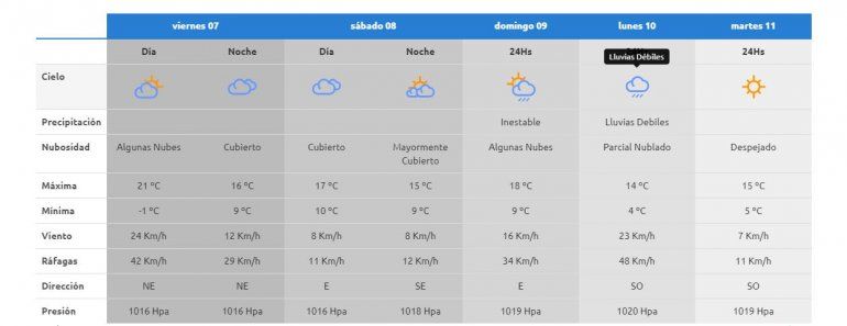 El viernes sube un poco la temperatura con una máxima que alcanzará los 21°C durante la tarde, con sol radiante. La mínima durante el amanecer será de -1.