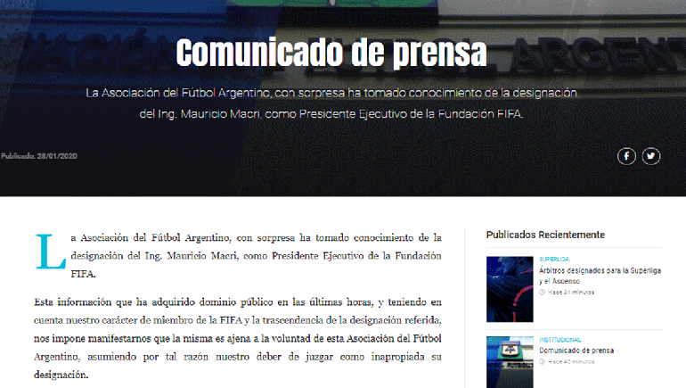 En un comunicado, la organización presidida por Claudio "Chiqui" Tapia afirmó: